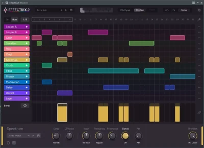 Instead of applying an effect to an entire track, you decide exactly which beat gets a stutter, which gets a reverse, and where a Tonal Delay creates melodic echoes. Empty cells pass dry audio, so the pattern you draw becomes an integral part of the composition. Artists like Sigur Rós, Armin van Buuren, and Diplo use Effectrix 2 as much a creative instrument as an effect processor.